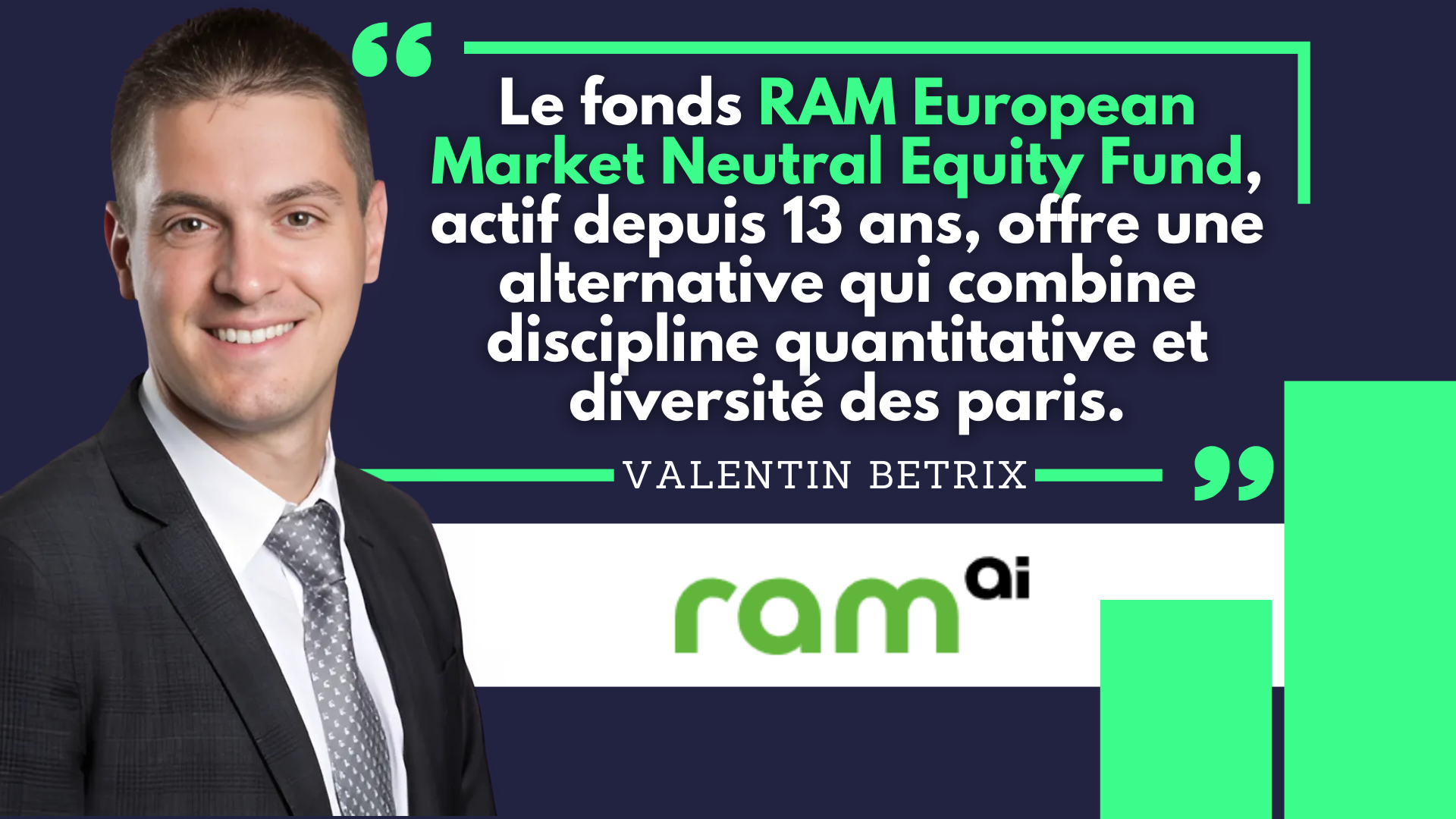 « Le fonds RAM European Market Neutral Equity Fund, actif depuis 13 ans, offre une alternative qui combine discipline quantitative et diversité des paris », suggère Valentin Betrix. Cette stratégie a pour objectif de décorréler la performance du fonds des grands mouvements macroéconomiques : politique monétaire, tensions géopolitiques ou cycles économiques. En ciblant un bêta neutre, le fonds vise une performance indépendante de la direction des marchés.